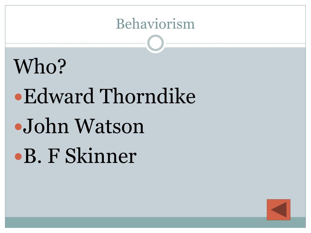 Behaviorism Who? Edward Thorndike John Watson B. F Skinner