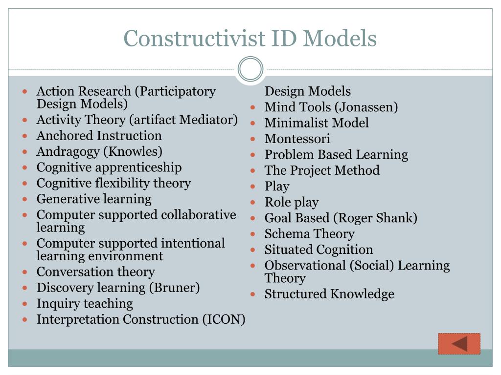 Constructivist ID Models Action Research (Participatory Design Models) Activity Theory (artifact Mediator) Anchored Instruction Andragogy (Knowles) Cognitive apprenticeship Cognitive flexibility theory Generative learning Computer supported collaborative learning Computer supported intentional learning environment Conversation theory Discovery learning (Bruner) Inquiry teaching Interpretation Construction (ICON) Design Models Mind Tools (Jonassen) Minimalist Model Montessori Problem Based Learning The Project Method Play Role play Goal Based (Roger Shank) Schema Theory Situated Cognition Observational (Social) Learning Theory Structured Knowledge