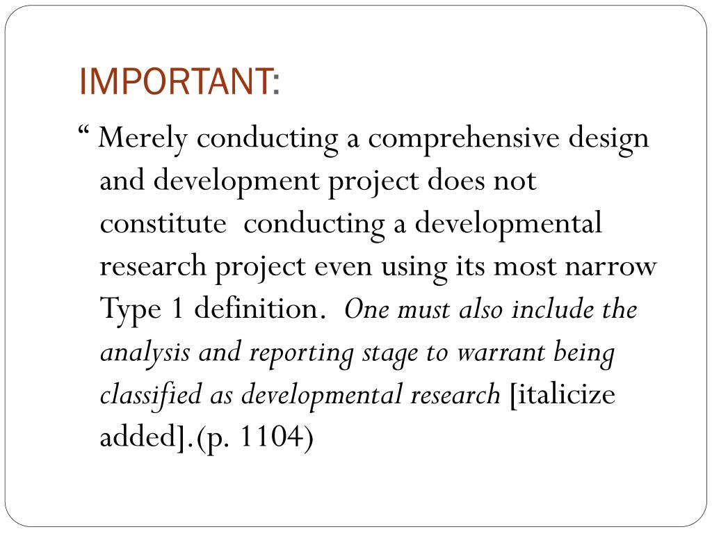 IMPORTANT: “ Merely conducting a comprehensive design and development project does not constitute conducting a developmental research project even using its most narrow Type 1 definition. One must also include the analysis and reporting stage to warrant being classified as developmental research [italicize added].(p. 1104)