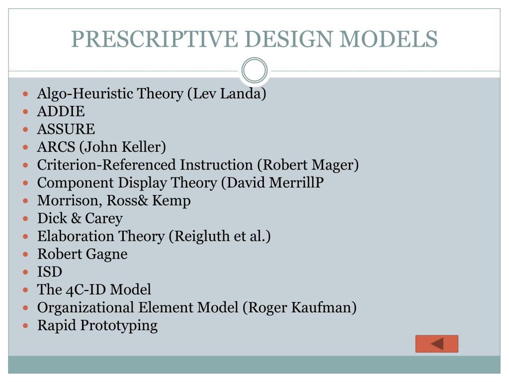 PRESCRIPTIVE DESIGN MODELS Algo-Heuristic Theory (Lev Landa) ADDIE ASSURE ARCS (John Keller) Criterion-Referenced Instruction (Robert Mager) Component Display Theory (David MerrillP Morrison, Ross& Kemp Dick & Carey Elaboration Theory (Reigluth et al.) Robert Gagne ISD The 4C-ID Model Organizational Element Model (Roger Kaufman) Rapid Prototyping