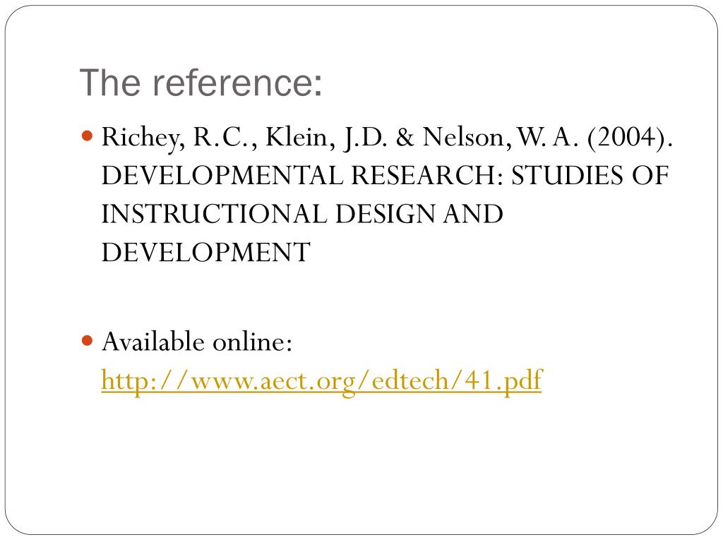 The reference: • Richey, R.C., Klein, J.D. & Nelson, W. A. (2004). DEVELOPMENTAL RESEARCH: STUDIES OF INSTRUCTIONAL DESIGN AND DEVELOPMENT • Available online: http://www.aect.org/edtech/41.pdf