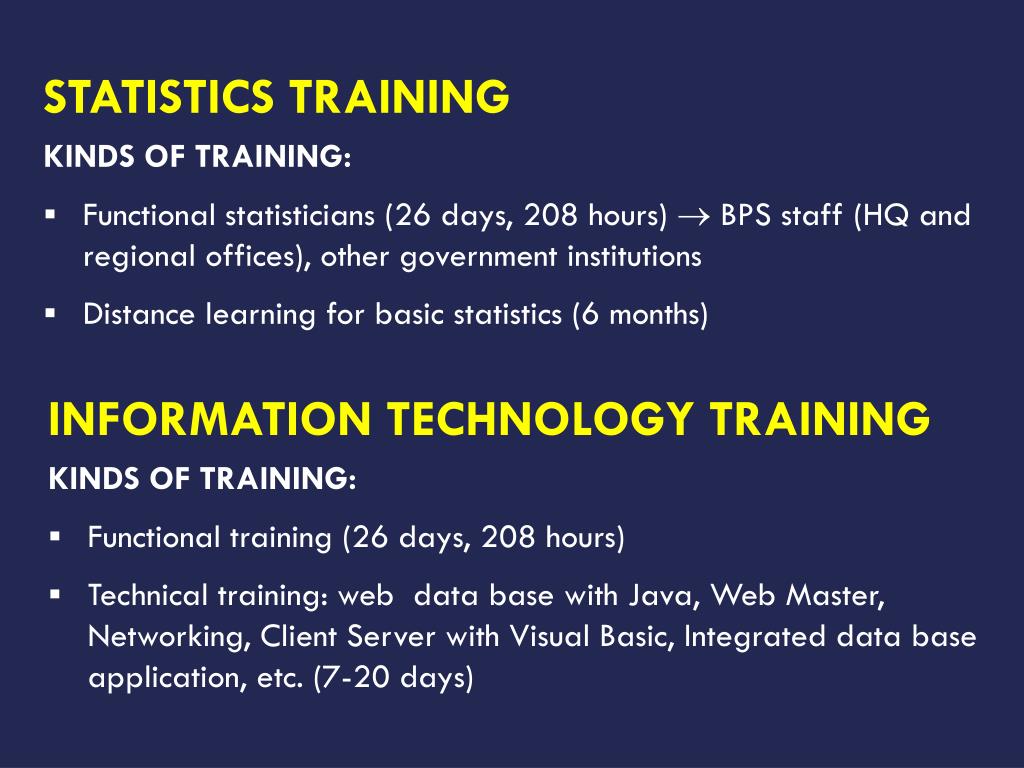 STATISTICS TRAINING KINDS OF TRAINING: Functional statisticians (26 days, 208 hours) BPS staff (HQ and regional offices), other government institutions Distance learning for basic statistics (6 months) INFORMATION TECHNOLOGY TRAINING KINDS OF TRAINING: Functional training (26 days, 208 hours) Technical training: web data base with Java, Web Master, Networking, Client Server with Visual Basic, Integrated data base application, etc. (7-20 days)