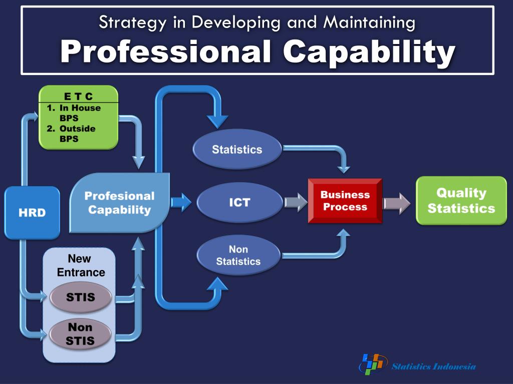 Strategy in Developing and Maintaining Professional Capability • E T C • In House BPS • Outside BPS Statistics ICT Profesional Capability Quality Statistics Business Process HRD Non Statistics New Entrance STIS Non STIS Statistics Indonesia