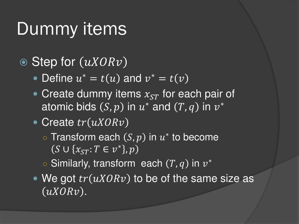 Dummy items • Step for • Define and • Create dummy items for each pair of atomic bids in and in • Create • Transform each in to become • Similarly, transform each in • We got to be of the same size as.