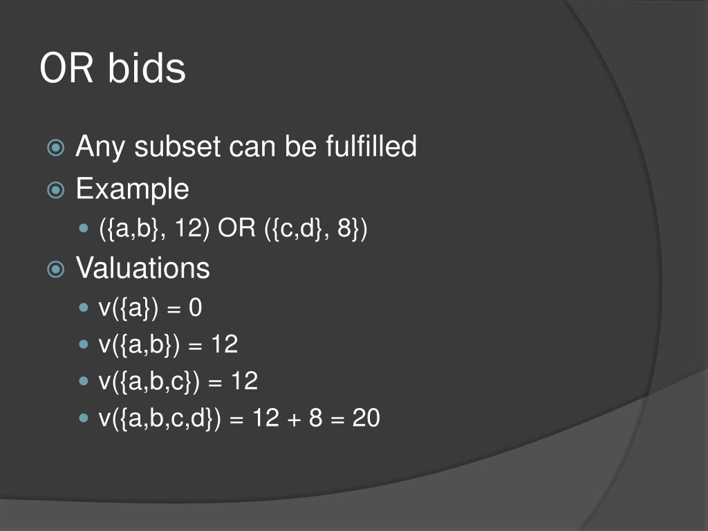 OR bids • Any subset can be fulfilled • Example • ({a,b}, 12) OR ({c,d}, 8}) • Valuations • v({a}) = 0 • v({a,b}) = 12 • v({a,b,c}) = 12 • v({a,b,c,d}) = 12 + 8 = 20