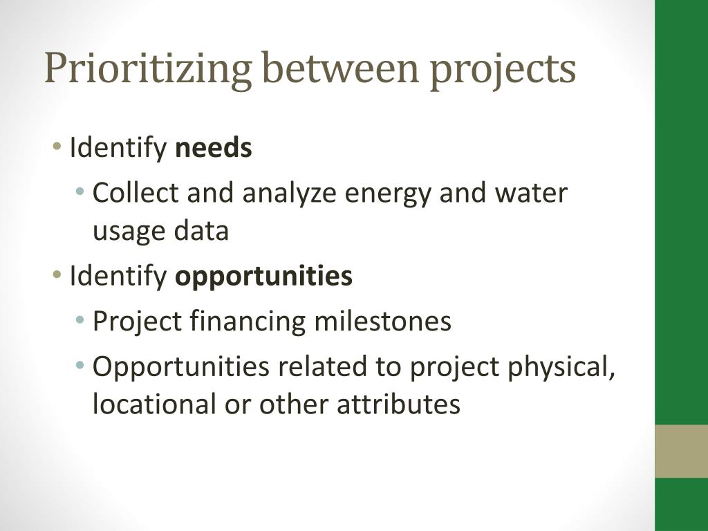 Prioritizing between projects • Identify needs • Collect and analyze energy and water usage data • Identify opportunities • Project financing milestones • Opportunities related to project physical, locational or other attributes
