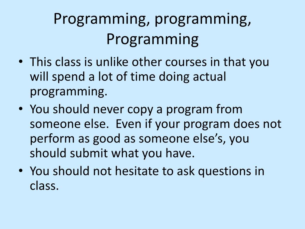 Programming, programming, Programming • This class is unlike other courses in that you will spend a lot of time doing actual programming. • You should never copy a program from someone else. Even if your program does not perform as good as someone else’s, you should submit what you have. • You should not hesitate to ask questions in class.