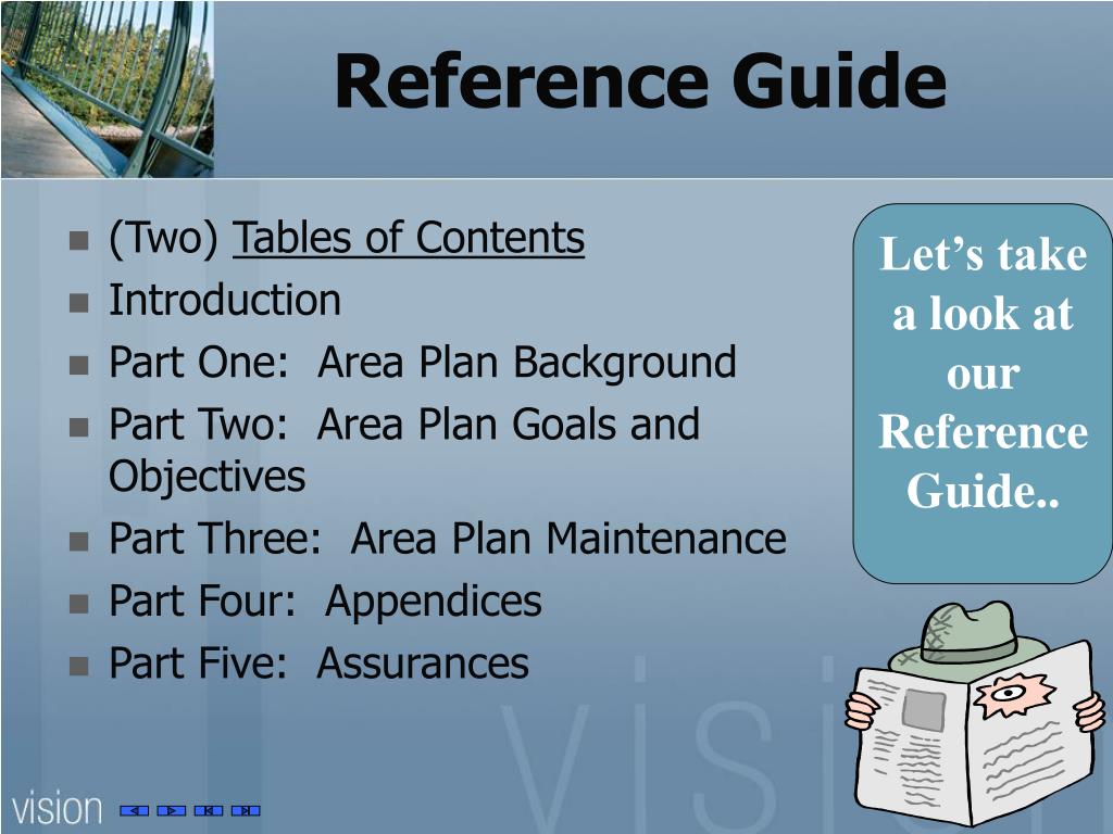 Reference Guide • (Two) Tables of Contents • Introduction • Part One: Area Plan Background • Part Two: Area Plan Goals and Objectives • Part Three: Area Plan Maintenance • Part Four: Appendices • Part Five: Assurances Let’s take a look at our Reference Guide..