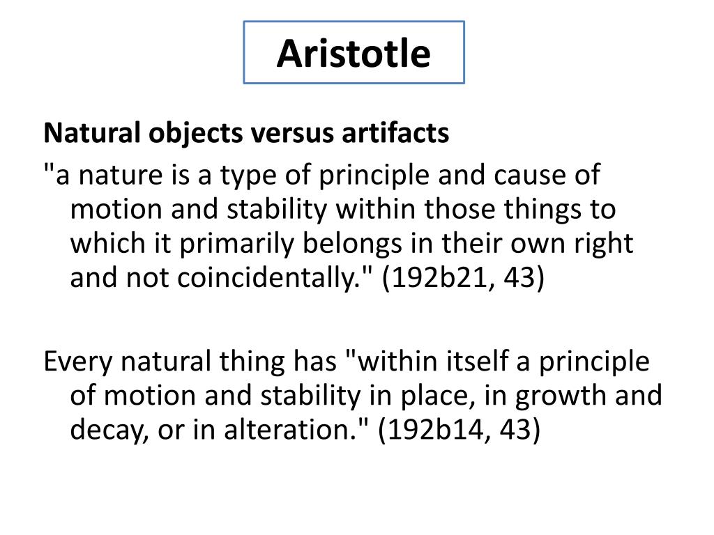 Aristotle Natural objects versus artifacts "a nature is a type of principle and cause of motion and stability within those things to which it primarily belongs in their own right and not coincidentally." (192b21, 43) Every natural thing has "within itself a principle of motion and stability in place, in growth and decay, or in alteration." (192b14, 43)