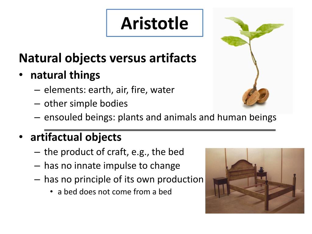 Aristotle Natural objects versus artifacts • natural things • elements: earth, air, fire, water • other simple bodies • ensouled beings: plants and animals and human beings • artifactual objects • the product of craft, e.g., the bed • has no innate impulse to change • has no principle of its own production • a bed does not come from a bed