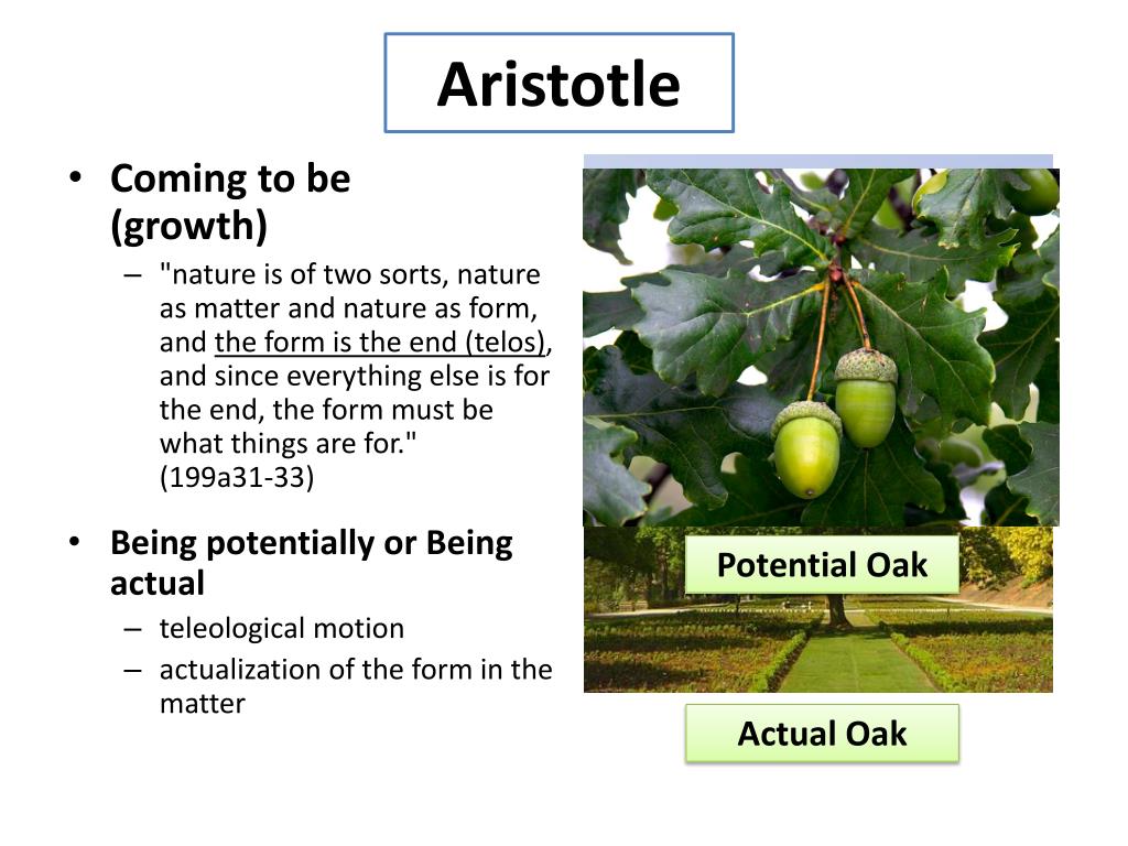 Aristotle • Coming to be (growth) • "nature is of two sorts, nature as matter and nature as form, and the form is the end (telos), and since everything else is for the end, the form must be what things are for." (199a31‑33) • Being potentially or Being actual • teleological motion • actualization of the form in the matter Potential Oak Actual Oak