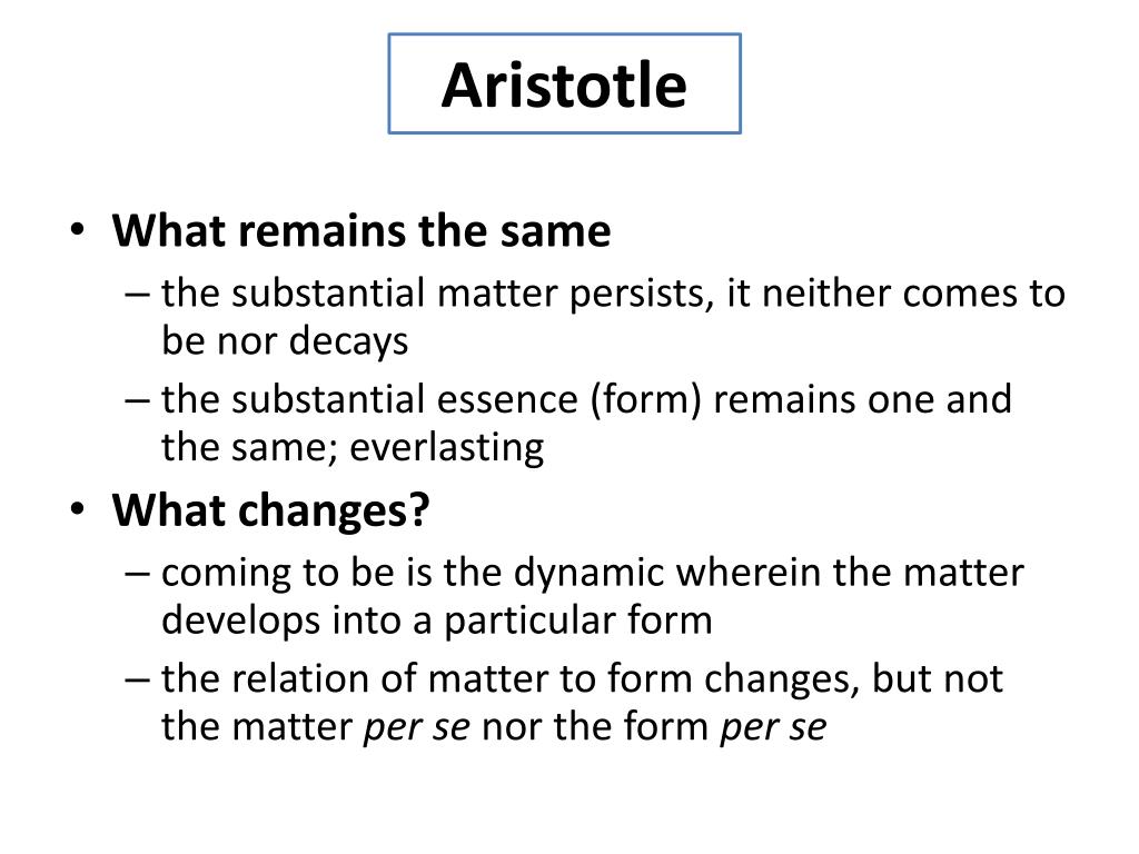 Aristotle • What remains the same • the substantial matter persists, it neither comes to be nor decays • the substantial essence (form) remains one and the same; everlasting • What changes? • coming to be is the dynamic wherein the matter develops into a particular form • the relation of matter to form changes, but not the matter per se nor the form per se