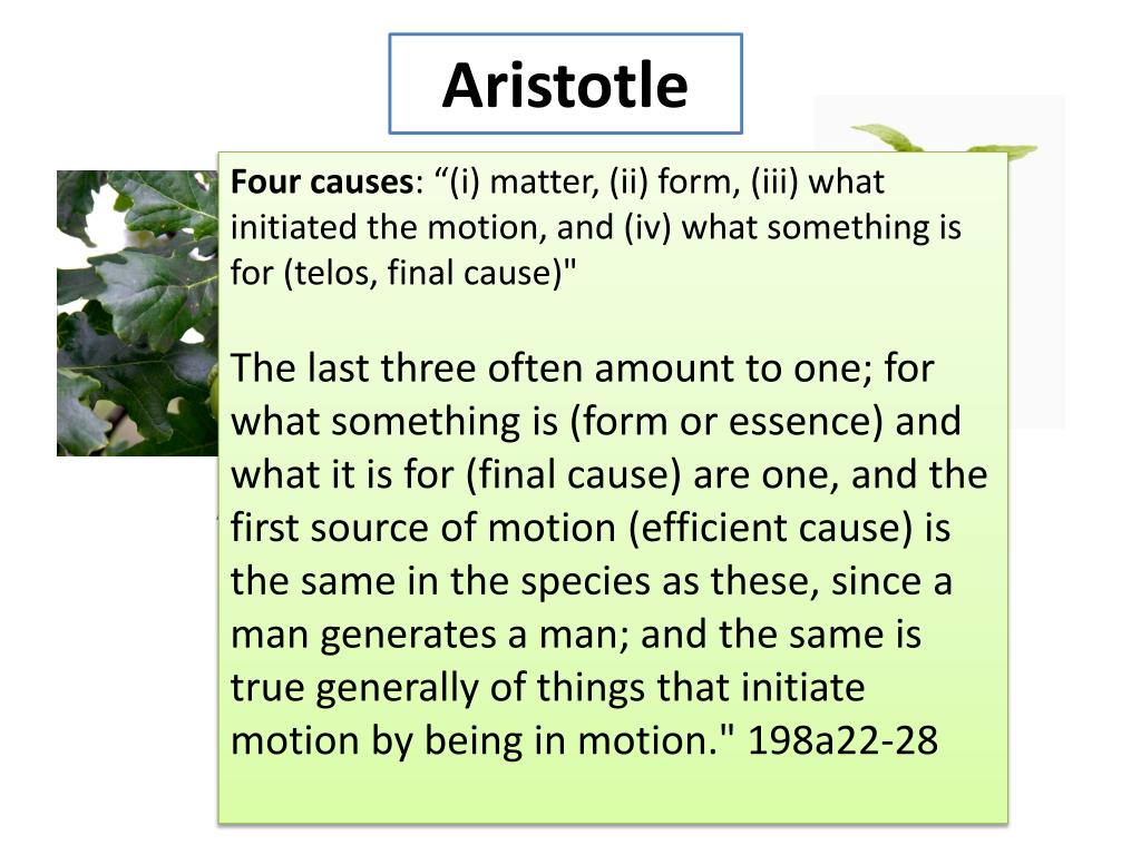 Aristotle Four causes: “(i) matter, (ii) form, (iii) what initiated the motion, and (iv) what something is for (telos, final cause)" The last three often amount to one; for what something is (form or essence) and what it is for (final cause) are one, and the first source of motion (efficient cause) is the same in the species as these, since a man generates a man; and the same is true generally of things that initiate motion by being in motion." 198a22-28