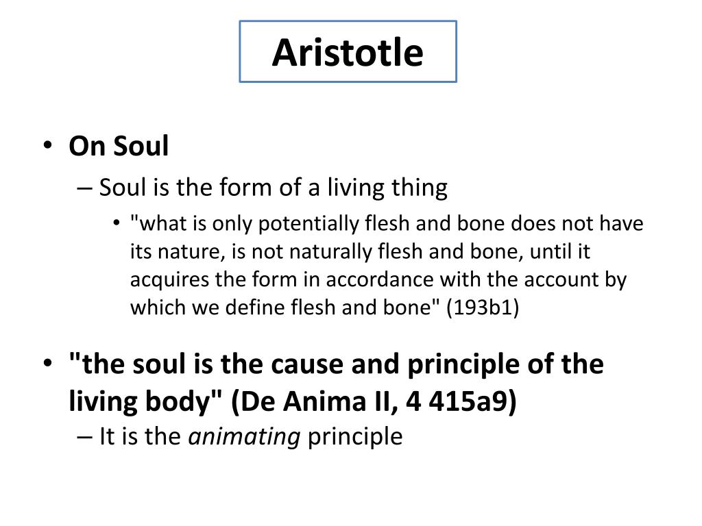 Aristotle • On Soul • Soul is the form of a living thing • "what is only potentially flesh and bone does not have its nature, is not naturally flesh and bone, until it acquires the form in accordance with the account by which we define flesh and bone" (193b1) • "the soul is the cause and principle of the living body" (De Anima II, 4 415a9) • It is the animating principle