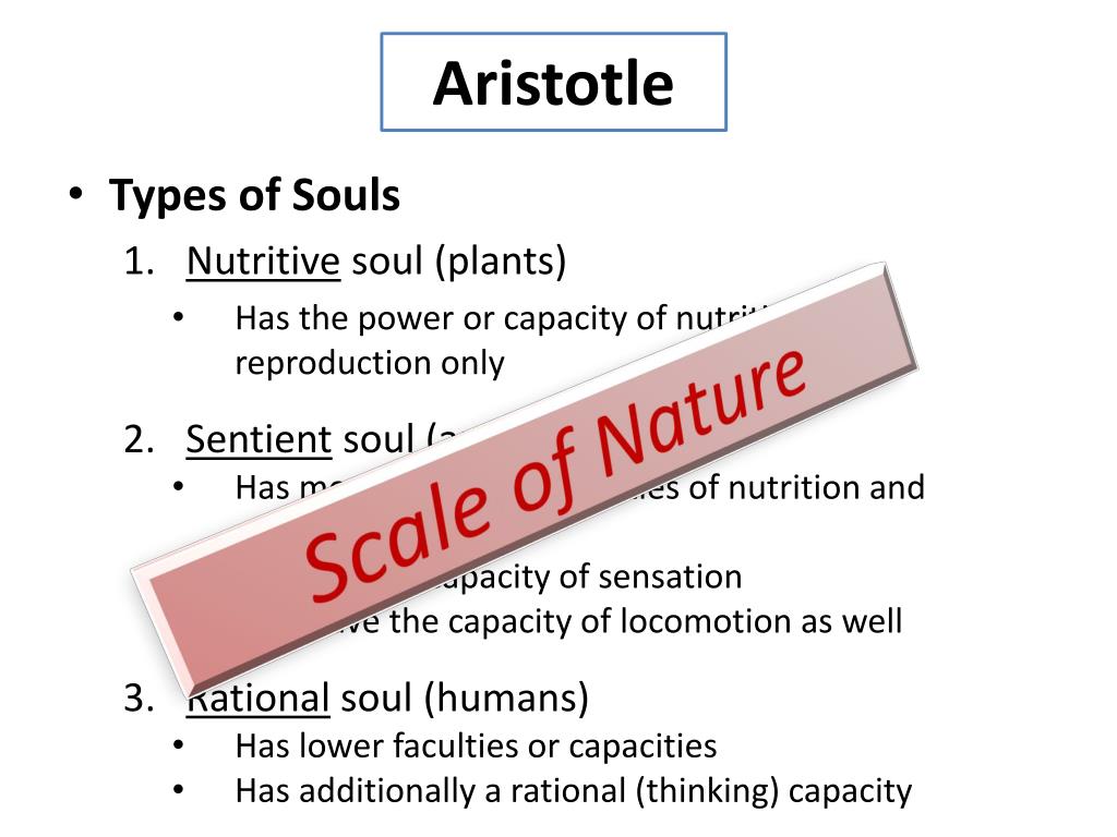Aristotle • Types of Souls • Nutritive soul (plants) • Has the power or capacity of nutrition and reproduction only • Sentient soul (animals) • Has more primitive capacities of nutrition and reproduction • Also has the capacity of sensation • May have the capacity of locomotion as well • Rational soul (humans) • Has lower faculties or capacities • Has additionally a rational (thinking) capacity Scale of Nature