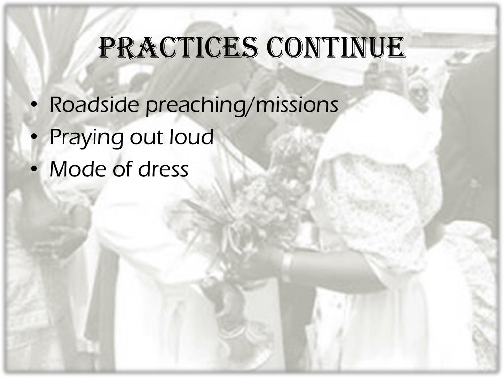 Practices continue • Roadside preaching/missions • Praying out loud • Mode of dress