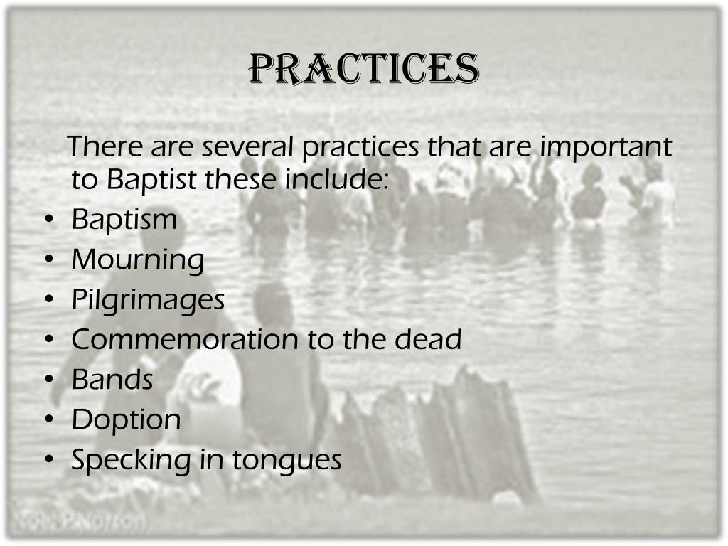 practices There are several practices that are important to Baptist these include: • Baptism • Mourning • Pilgrimages • Commemoration to the dead • Bands • Doption • Specking in tongues