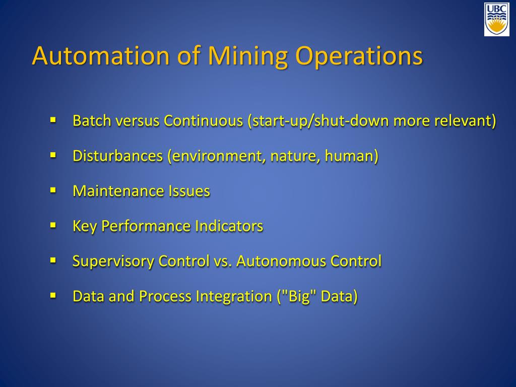 Batch versus Continuous (start-up/shut-down more relevant) Disturbances (environment, nature, human) Maintenance Issues Key Performance Indicators Supervisory Control vs. Autonomous Control Data and Process Integration ("Big" Data) Automation of Mining Operations