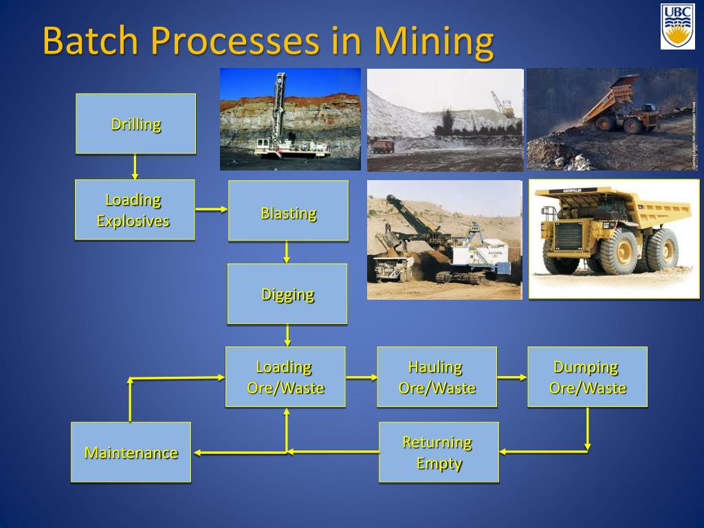 Batch Processes in Mining Drilling Loading Explosives Blasting Digging Loading Ore/Waste Hauling Ore/Waste Dumping Ore/Waste Maintenance Returning Empty