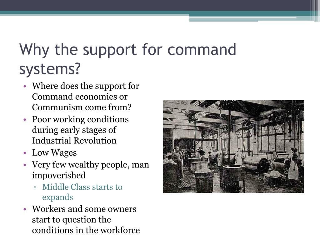 Why the support for command systems? • Where does the support for Command economies or Communism come from? • Poor working conditions during early stages of Industrial Revolution • Low Wages • Very few wealthy people, man impoverished • Middle Class starts to expands • Workers and some owners start to question the conditions in the workforce
