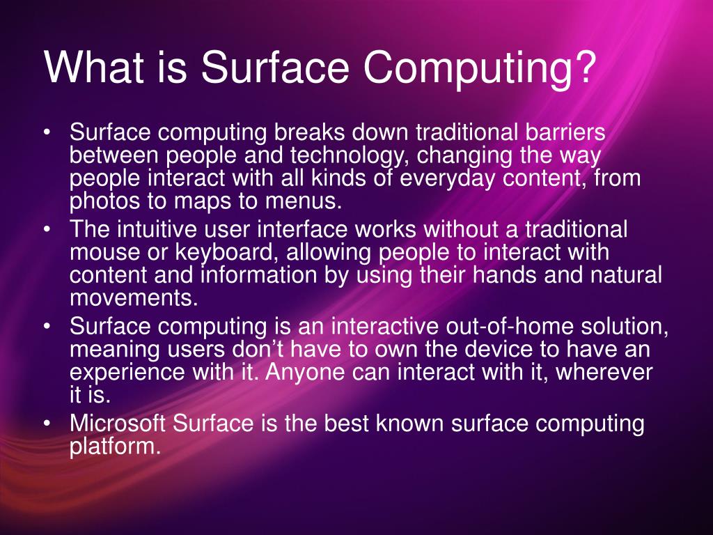 What is Surface Computing? • Surface computing breaks down traditional barriers between people and technology, changing the way people interact with all kinds of everyday content, from photos to maps to menus. • The intuitive user interface works without a traditional mouse or keyboard, allowing people to interact with content and information by using their hands and natural movements. • Surface computing is an interactive out-of-home solution, meaning users don’t have to own the device to have an experience with it. Anyone can interact with it, wherever it is. • Microsoft Surface is the best known surface computing platform.
