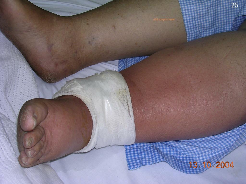 428 surgery team NECROTIZING FASCIITISwe have 2 do the investigation 2 differentiated from simple crllulitis • Diabetics more susceptible • Starts as cellulitis, edema, systemic toxicity • Appears less extensive than actual necrosis • Investigation: Aspiration, Gram’s stain, CT, MRI • Treatment: IV fluid, IV antibiotics (ampicillin, clindamycin l metronidazole, aminoglycosides ) Debridement , repeated dressings, skin grafting