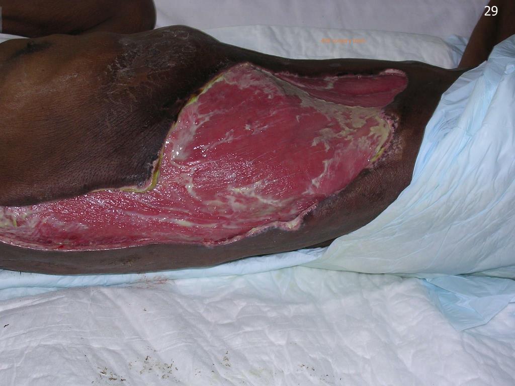 428 surgery team NECROTIZING FASCIITIS • Necrosis of superficial fascia, overlying skin • Polymicrobial : Streptococci (90%), anaerobic Grampositive Cocci, aerobic Gram-negative Bacilli, and the Bacteroides spp. • Sites- abd.wall (Meleny’s), perineum(Fournier’s), limbs, • Usually follows abdominal surgery or trauma
