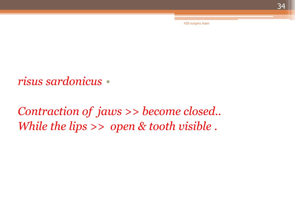 428 surgery team • risus sardonicus Contraction of jaws >> become closed.. While the lips >> open & tooth visible .