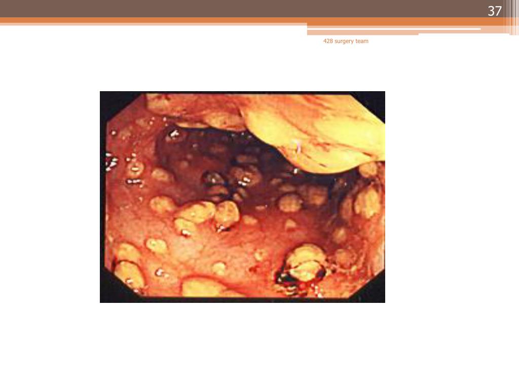 428 surgery team PSEUDOMEMBRANOUS COLITIS gram + • Cl. Difficile • Overtakes normal flora in patients on antibiotics • Watery diarrhea, abdominal pain, fever • Sigmoidoscopy show: membrane of exudates (pseudomembranes) • Diagnosis :Stool- culture and toxin assay • Treatment : stop offending antibiotic oral vancomycin/ metronidazole rehydration, isolate patient