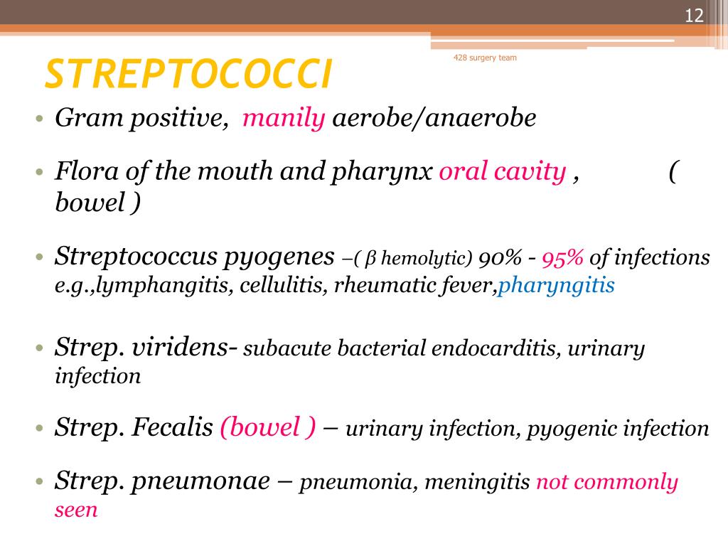 428 surgery team STREPTOCOCCI • Gram positive, manilyaerobe/anaerobe • Flora of the mouth and pharynx oral cavity , ( bowel ) • Streptococcus pyogenes–( β hemolytic) 90% - 95% of infections e.g.,lymphangitis, cellulitis, rheumatic fever,pharyngitis • Strep. viridens-subacute bacterial endocarditis, urinary infection • Strep. Fecalis(bowel ) – urinary infection, pyogenic infection • Strep. pneumonae – pneumonia, meningitis not commonly seen