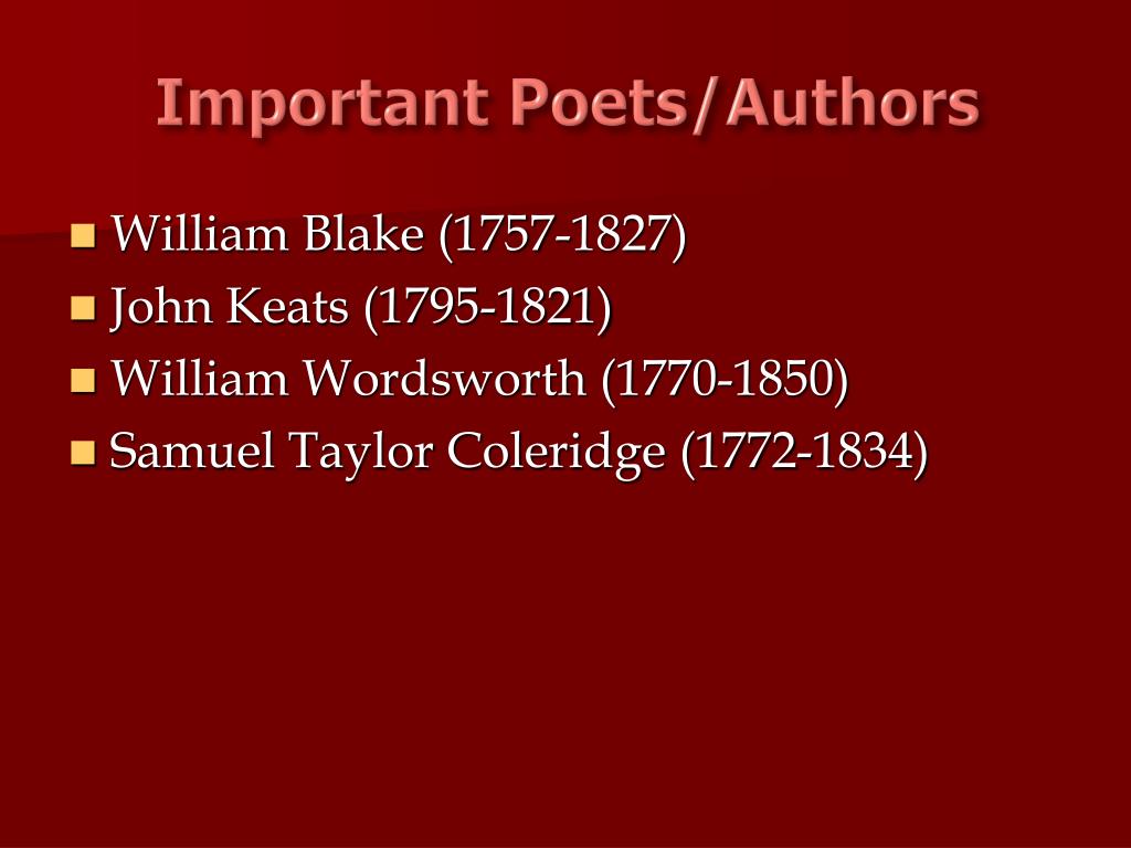 Important Poets/Authors William Blake (1757-1827) John Keats (1795-1821) William Wordsworth (1770-1850) Samuel Taylor Coleridge (1772-1834)