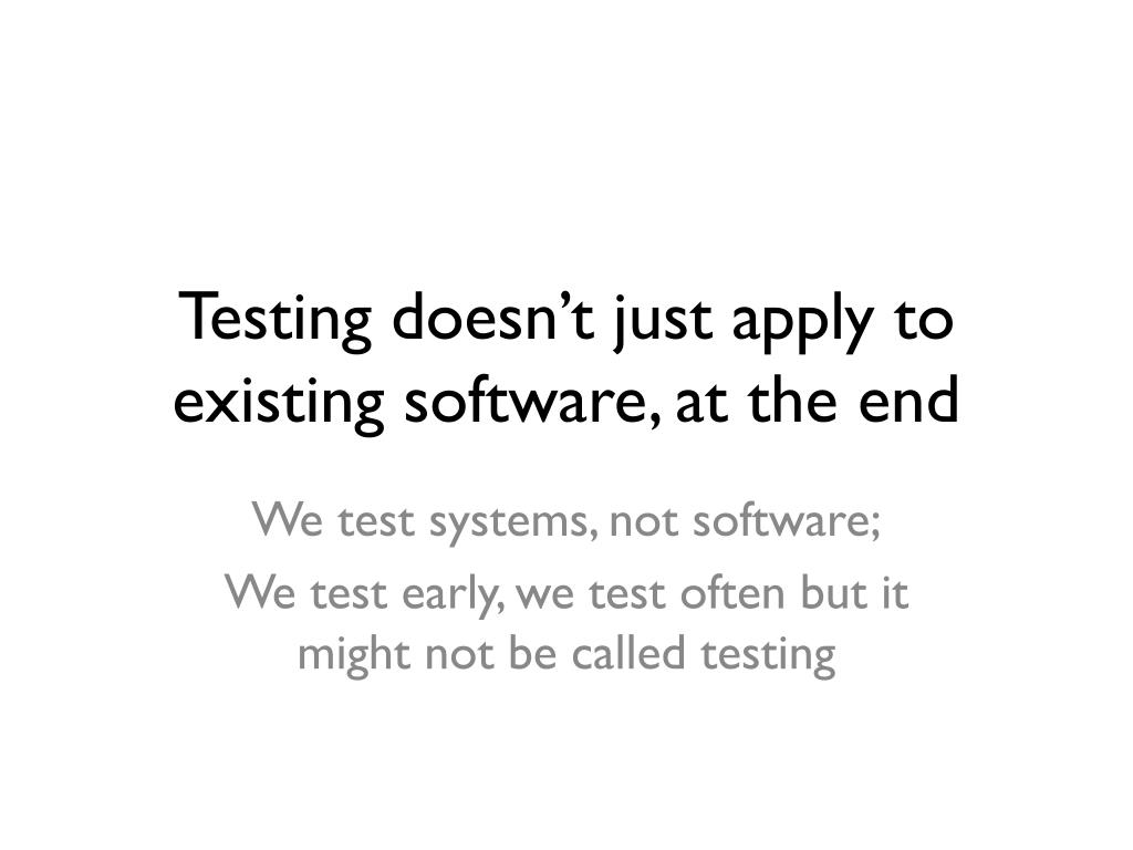 Testing doesn’t just apply to existing software, at the end We test systems, not software; We test early, we test often but it might not be called testing