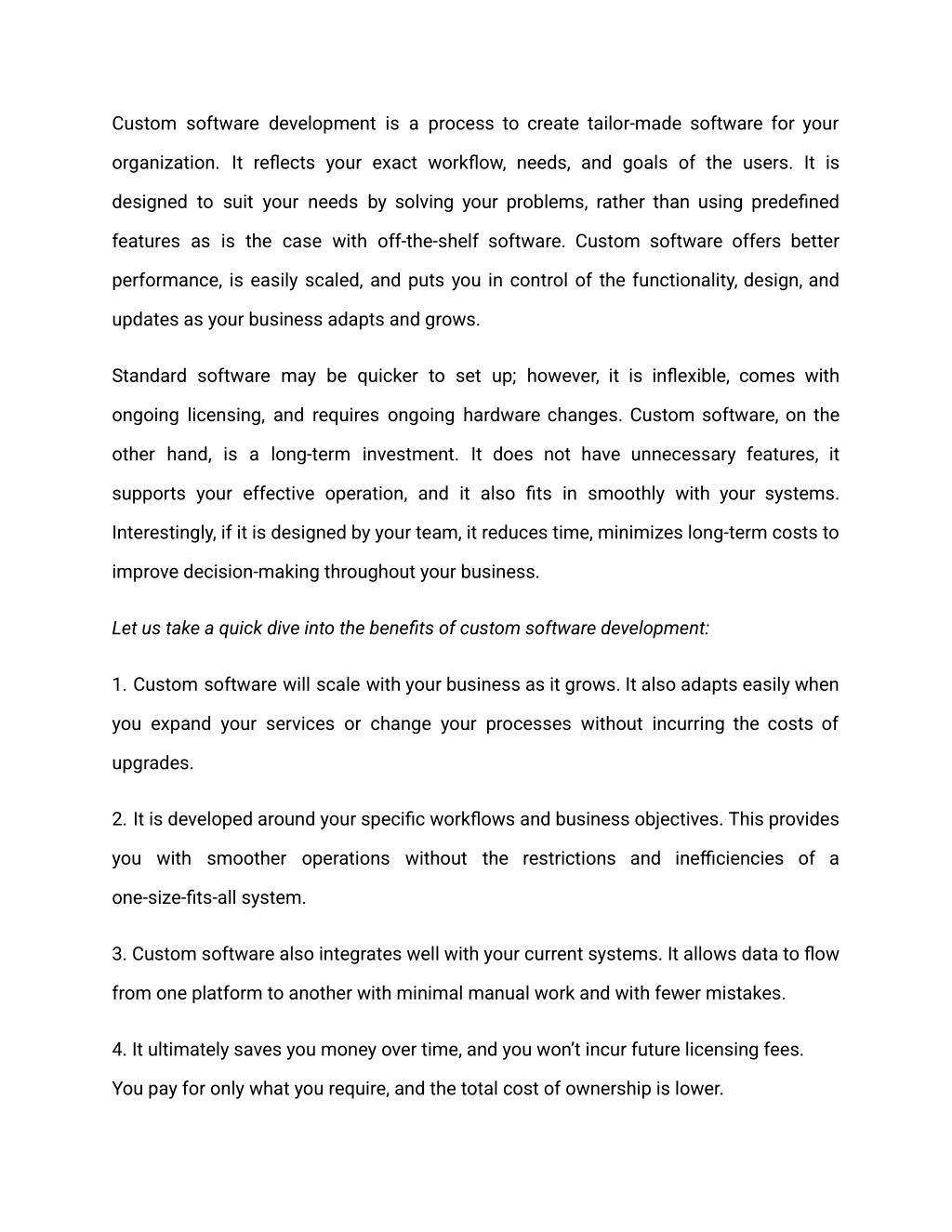 Custom software development is a process to create tailor-made software for your organization. It reflects your exact workflow, needs, and goals of the users. It is designed to suit your needs by solving your problems, rather than using predefined features as is the case with off-the-shelf software. Custom software offers better performance, is easily scaled, and puts you in control of the functionality, design, and updates as your business adapts and grows. Standard software may be quicker to set up; however, it is inflexible, comes with ongoing licensing, and requires ongoing hardware changes. Custom software, on the other hand, is a long-term investment. It does not have unnecessary features, it supports your effective operation, and it also fits in smoothly with your systems. Interestingly, if it is designed by your team, it reduces time, minimizes long-term costs to improve decision-making throughout your business. Let us take a quick dive into the benefits of custom software development: 1. Custom software will scale with your business as it grows. It also adapts easily when you expand your services or change your processes without incurring the costs of upgrades. 2. It is developed around your specific workflows and business objectives. This provides you with smoother operations without the restrictions and inefficiencies of a one-size-fits-all system. 3. Custom software also integrates well with your current systems. It allows data to flow from one platform to another with minimal manual work and with fewer mistakes. 4. It ultimately saves you money over time, and you won’t incur future licensing fees. You pay for only what you require, and the total cost of ownership is lower.