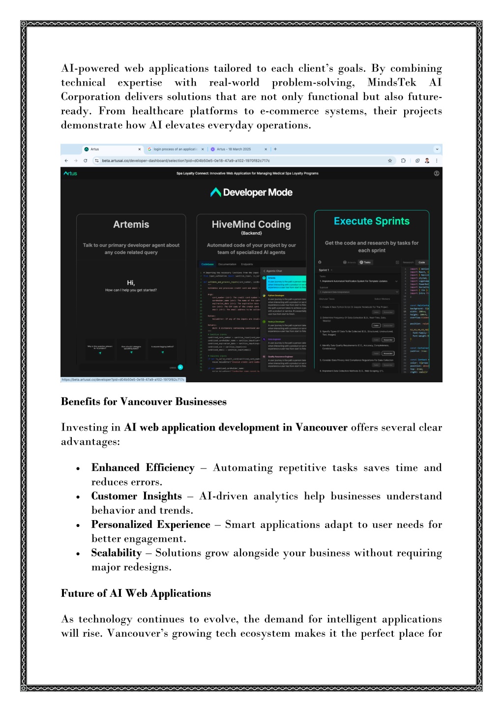 businesses to adopt these innovations. AI web application development in Vancouver is no longer just a trend—it’s becoming a necessity for companies that want to remain competitive. Conclusion For organizations looking to harness the power of AI, MindsTek AI Corporation provides the expertise and creativity needed to succeed. Their tailored solutions help businesses in Vancouver transform ideas into intelligent web applications that drive results. With AI shaping the future of digital experiences, now is the time to invest in smarter web solutions. CONTACT US Our Location: 104-1363 Clyde Avenue, West Vancouver, British Columbia, Canada - V7T 2W9 Phone Number: +1 778-956-42837 Email: Info@MindsTekAI.com Website: www.MindsTekAI.com