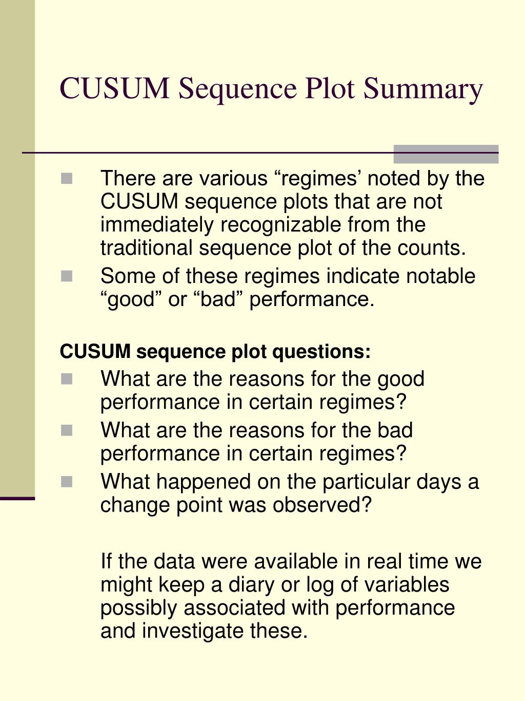 Other Questions For traditional sequence plots: • Are the spikes unusual when compared to what might happen under pure chance? • Are the zero count sequences unusual in the sense that they indicate the process has improved? For CUSUM sequence plots: • Are the regimes we observed unusual when compared to what might happen under pure chance?