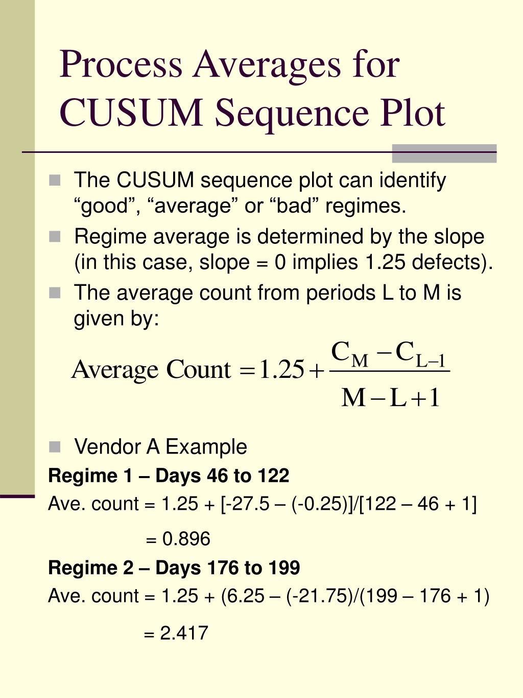Process Averages for CUSUM Sequence Plot • The CUSUM sequence plot can identify “good”, “average” or “bad” regimes. • Regime average is determined by the slope (in this case, slope = 0 implies 1.25 defects). • The average count from periods L to M is given by: • Vendor A Example Regime 1 – Days 46 to 122 Ave. count = 1.25 + [-27.5 – (-0.25)]/[122 – 46 + 1] = 0.896 Regime 2 – Days 176 to 199 Ave. count = 1.25 + (6.25 – (-21.75)/(199 – 176 + 1) = 2.417