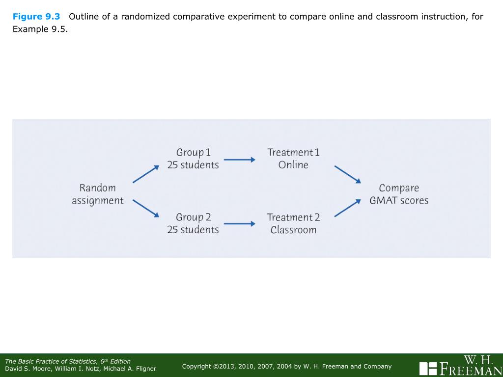Figure 9.3 Outline of a randomized comparative experiment to compare online and classroom instruction, for Example 9.5.
