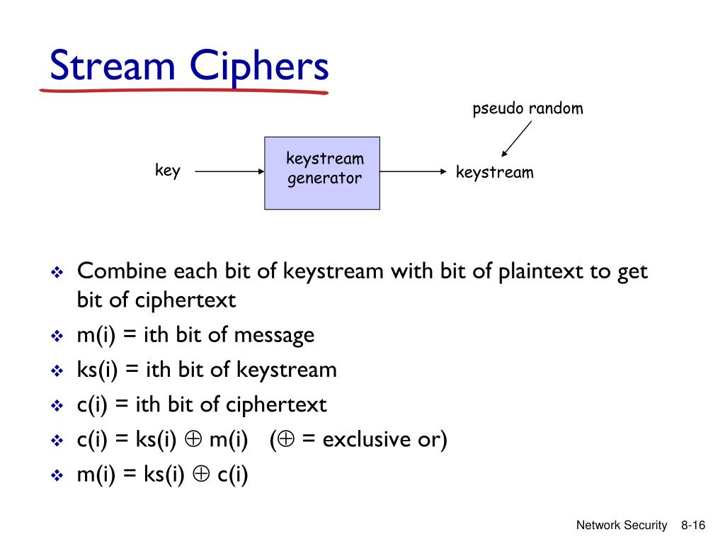 Stream Ciphers pseudo random • Combine each bit of keystream with bit of plaintext to get bit of ciphertext • m(i) = ith bit of message • ks(i) = ith bit of keystream • c(i) = ith bit of ciphertext • c(i) = ks(i) m(i) ( = exclusive or) • m(i) = ks(i) c(i) keystream generator key keystream Network Security