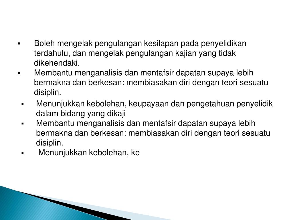 Bolehmengelakpengulangankesilapanpadapenyelidikanterdahulu, danmengelakpengulangankajian yang tidakdikehendaki. • Membantumenganalisisdanmentafsirdapatansupayalebihbermaknadanberkesan: membiasakandiridenganteorisesuatudisiplin. • Menunjukkankebolehan, keupayaandanpengetahuanpenyelidikdalambidang yang dikaji • Membantumenganalisisdanmentafsirdapatansupayalebihbermaknadanberkesan: membiasakandiridenganteorisesuatudisiplin. • Menunjukkankebolehan, ke