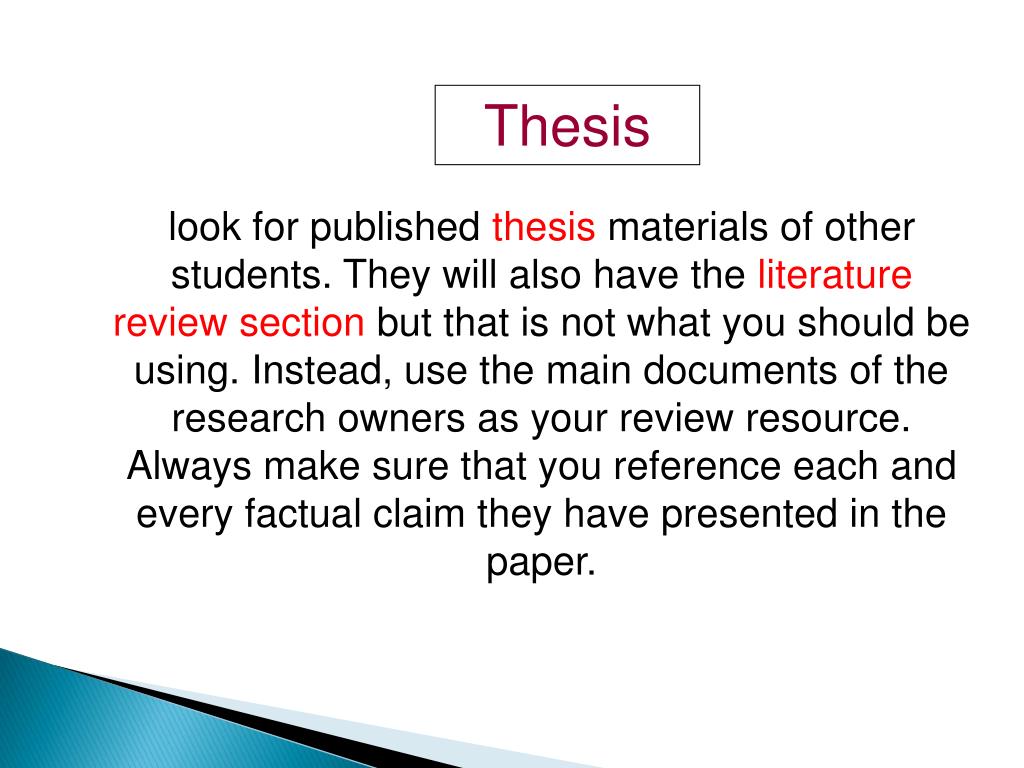 Thesis look for published thesis materials of other students. They will also have the literature review section but that is not what you should be using. Instead, use the main documents of the research owners as your review resource. Always make sure that you reference each and every factual claim they have presented in the paper.