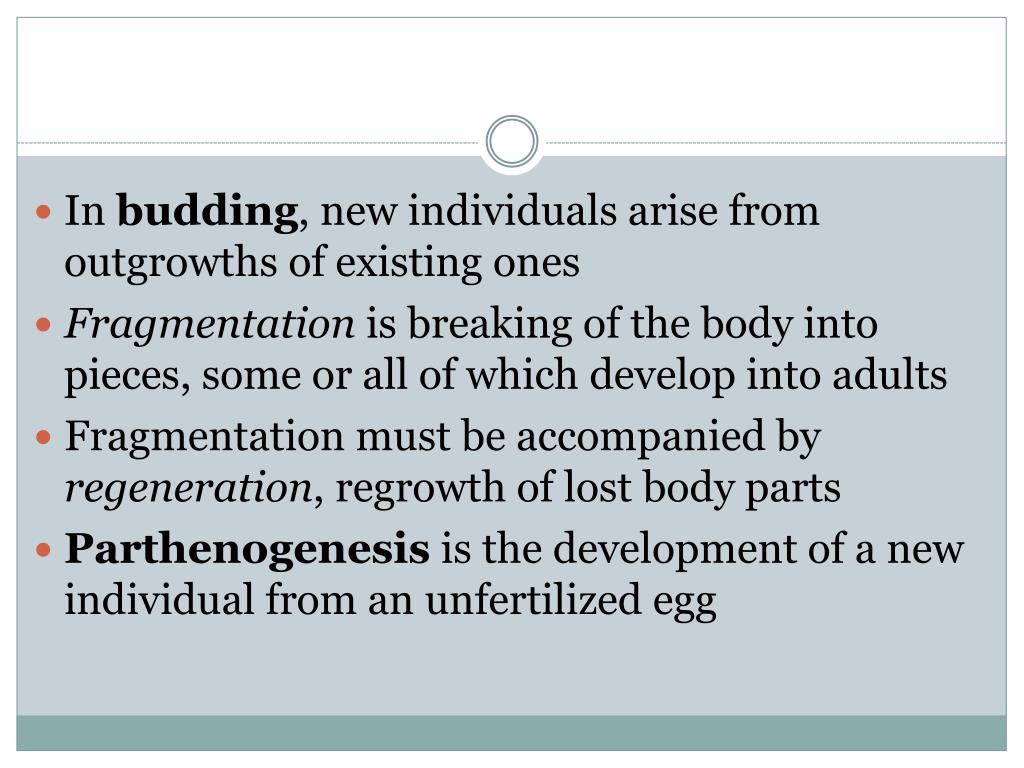 In budding, new individuals arise from outgrowths of existing ones • Fragmentation is breaking of the body into pieces, some or all of which develop into adults • Fragmentation must be accompanied by regeneration, regrowth of lost body parts • Parthenogenesis is the development of a new individual from an unfertilized egg