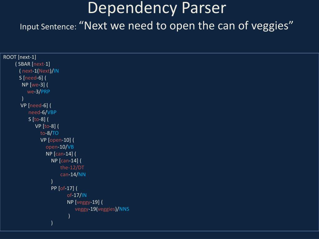 Dependency ParserInput Sentence: “Next we need to open the can of veggies” ROOT [next-1] ( SBAR [next-1] ( next-1(Next)/IN S [need-6] ( NP [we-3] ( we-3/PRP ) VP [need-6] ( need-6/VBP S [to-8] ( VP [to-8] ( to-8/TO VP [open-10] ( open-10/VB NP [can-14] ( NP [can-14] ( the-12/DT can-14/NN ) PP [of-17] ( of-17/IN NP [veggy-19] ( veggy-19(veggies)/NNS ) )