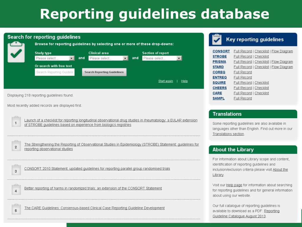 How I can improve reporting of my research study • Find out about reporting requirements early, when planning your research study • When writing up your research, check the EQUATOR website for any new relevant guidelines to help improve the quality of your manuscript • Adhere to the relevant reporting guideline(s). • When not reporting on certain items explain why. • Remember that reporting guidelines provide a minimum set of items; other details specific to your particular study might be relevant for a clear and complete account of what was done and found (consider in particular items that might have introduced bias into your research). • It is important to provide enough information to allow your study to be potentially reproducible by others. • See ‘Steps to consider’ in Simera et al. BMC Medicine 2010,8:24