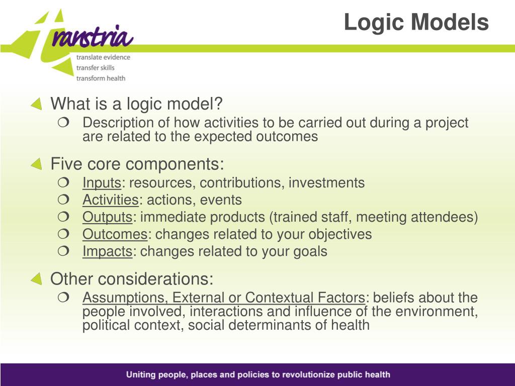 Logic Models • What is a logic model? • Description of how activities to be carried out during a project are related to the expected outcomes • Five core components: • Inputs: resources, contributions, investments • Activities: actions, events • Outputs: immediate products (trained staff, meeting attendees) • Outcomes: changes related to your objectives • Impacts: changes related to your goals • Other considerations: • Assumptions, External or Contextual Factors: beliefs about the people involved, interactions and influence of the environment, political context, social determinants of health