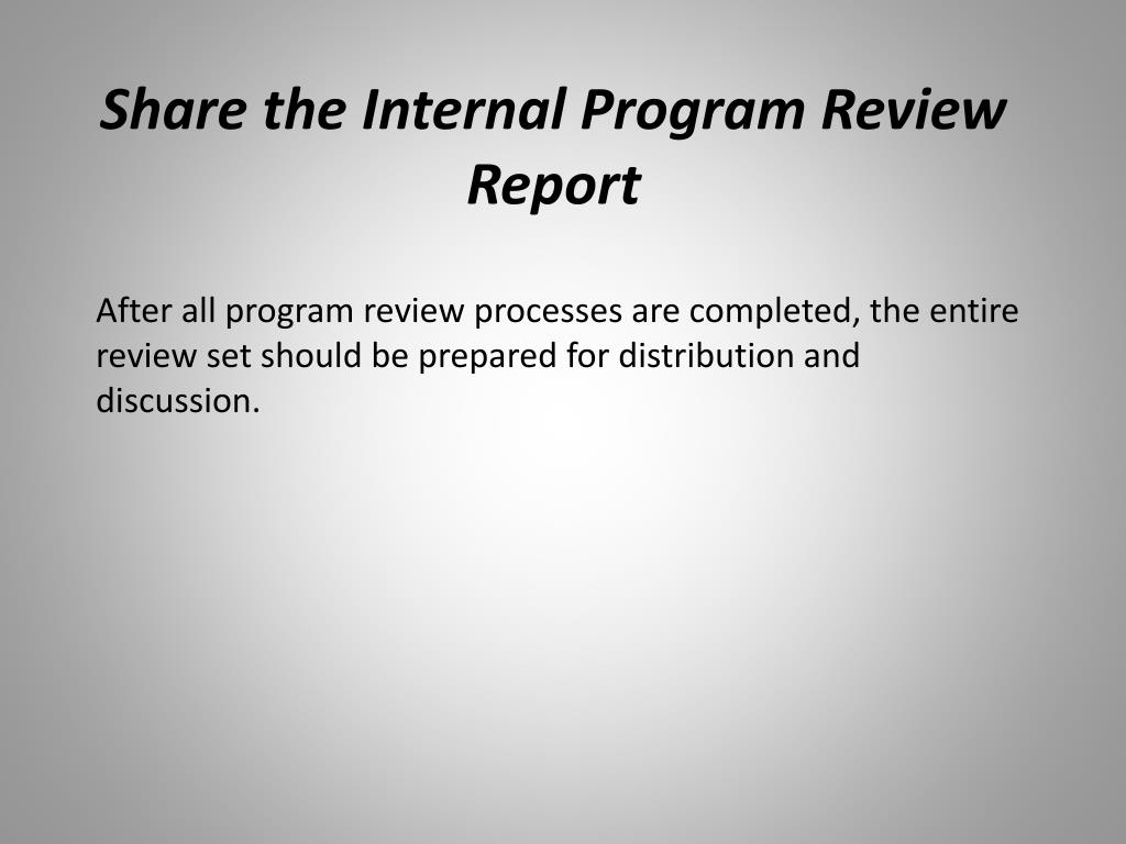 Share the Internal Program Review Report After all program review processes are completed, the entire review set should be prepared for distribution and discussion.