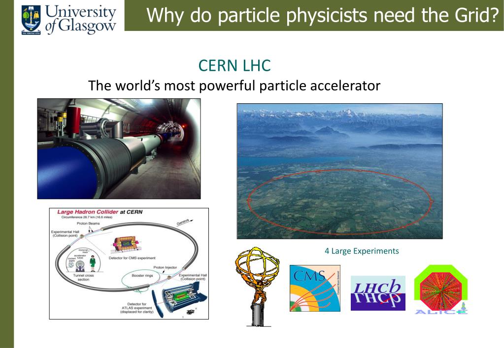 Four LHC Experiments • ATLAS • general purpose: origin of mass, supersymmetry, micro-black holes? • 2,000 scientists from 34 countries • CMS • general purpose detector • 1,800 scientists from 150 institutes • LHCb • to study the differences between matter and antimatter • producing over 100 million b and b-bar mesons each year • ALICE • heavy ion collisions, to create quark-gluon plasmas • 50,000 particles in each collision • “One Grid to Rule Them All”?