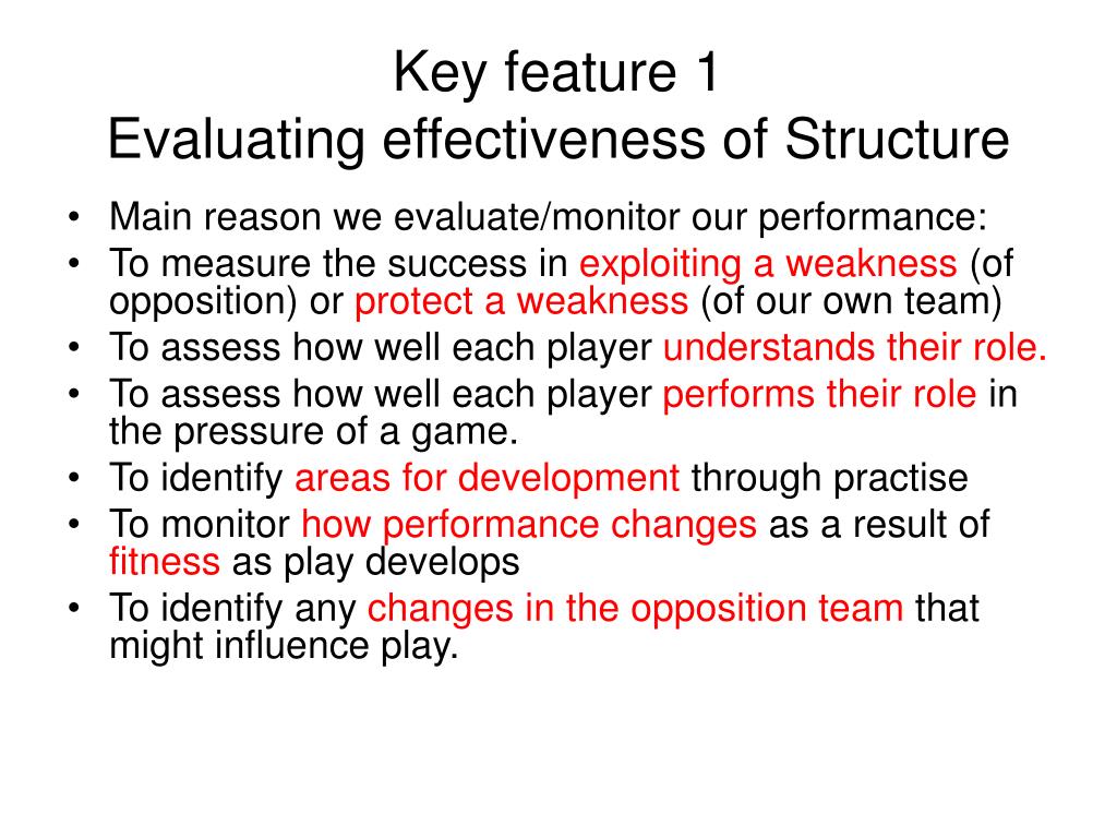 Key feature 1Evaluating effectiveness of Structure • Main reason we evaluate/monitor our performance: • To measure the success in exploiting a weakness (of opposition) or protect a weakness (of our own team) • To assess how well each player understands their role. • To assess how well each player performs their role in the pressure of a game. • To identify areas for development through practise • To monitor how performance changes as a result of fitness as play develops • To identify any changes in the opposition team that might influence play.