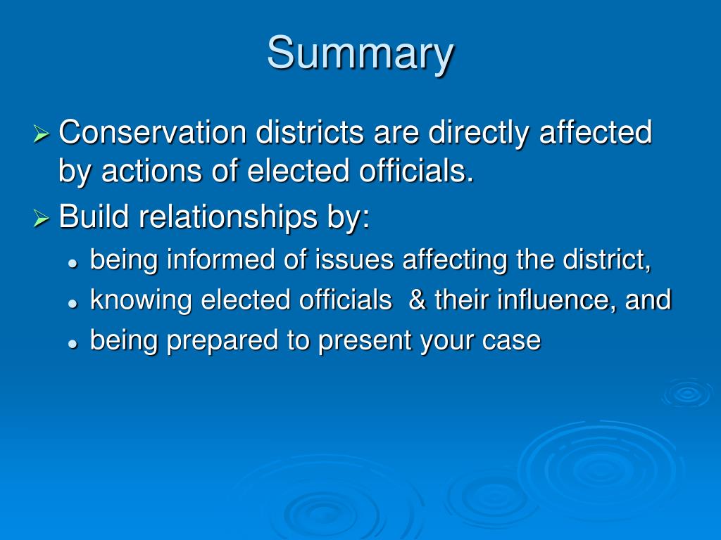 Summary • Conservation districts are directly affected by actions of elected officials. • Build relationships by: • being informed of issues affecting the district, • knowing elected officials & their influence, and • being prepared to present your case