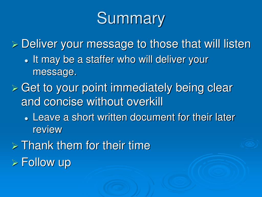 Summary • Deliver your message to those that will listen • It may be a staffer who will deliver your message. • Get to your point immediately being clear and concise without overkill • Leave a short written document for their later review • Thank them for their time • Follow up