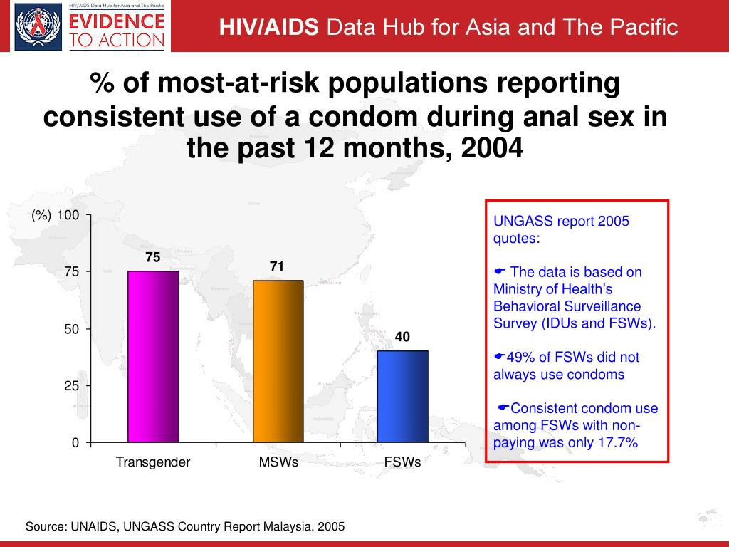 % of most-at-risk populations reporting consistent use of a condom during anal sex in the past 12 months, 2004 UNGASS report 2005 quotes: The data is based on Ministry of Health’s Behavioral Surveillance Survey (IDUs and FSWs). 49% of FSWs did not always use condoms Consistent condom use among FSWs with non-paying was only 17.7% Source: UNAIDS, UNGASS Country Report Malaysia, 2005